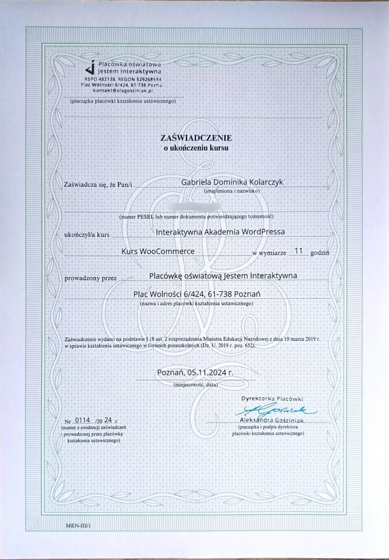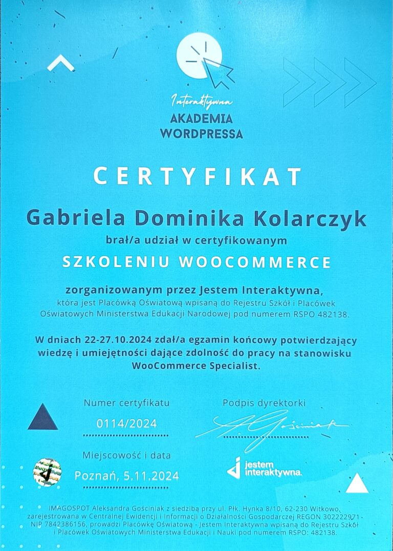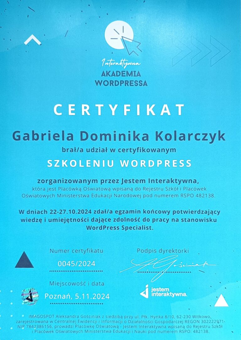 W 2023 roku, przez przypadek, natrafiłam na artykuł o WordPressie. Zaintrygował mnie on na tyle, że postanowiłam zgłębić temat i zacząć czytać więcej na ten temat. Moje poszukiwania zaprowadziły mnie do kursów, które ukończyłam, i wtedy uświadomiłam sobie, że to jest to, co naprawdę lubię. Dowiedziałam się, że WordPress daje ogromne możliwości, a jednocześnie pozwala mi pomagać firmom w ich rozwoju. To połączenie pasji i praktycznych umiejętności stało się moją ścieżką zawodową, którą postanowiłam podążać.